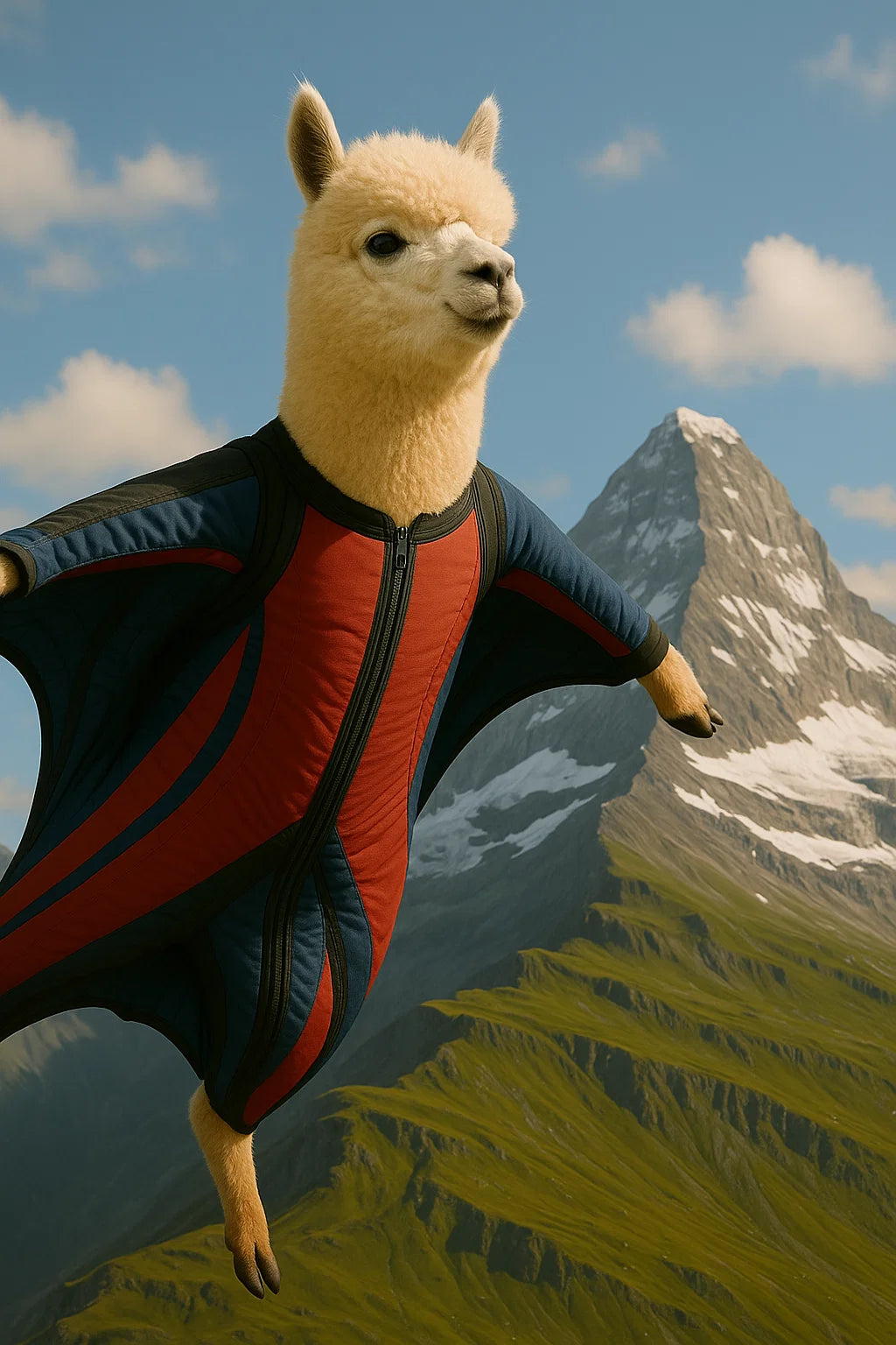 Introducing the airborne adrenaline junkie you didn’t know your life was missing. This daredevil Alpaca is mid-flight over majestic mountains, free of fear, gravity, and logic. What does he want? Thrill. What does he fear? Nothing. What is he wearing? A custom-fitted wingsuit, obviously.
