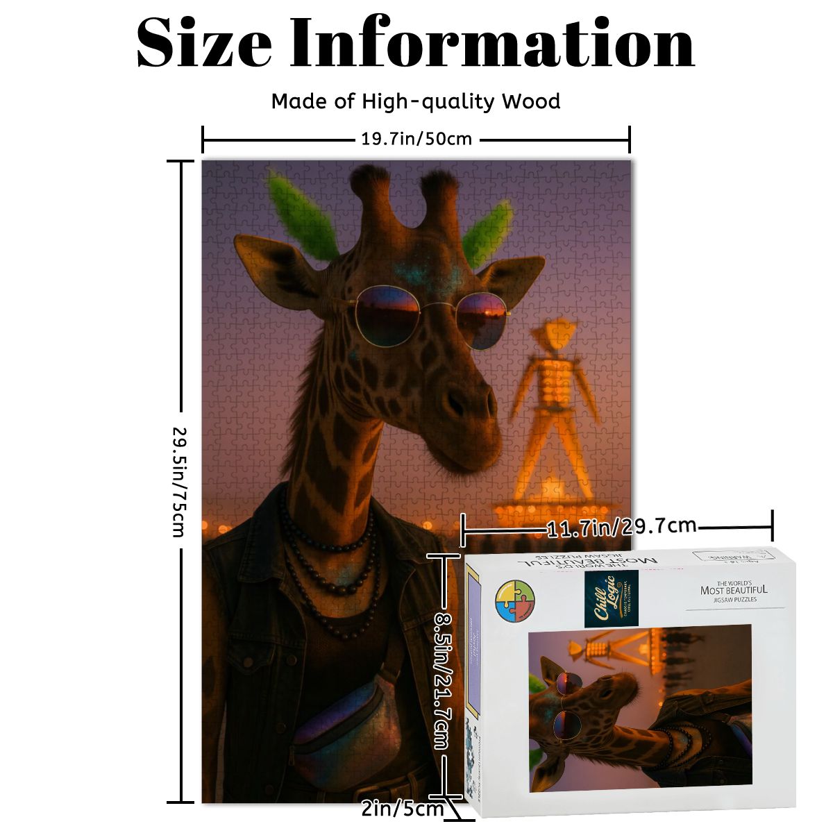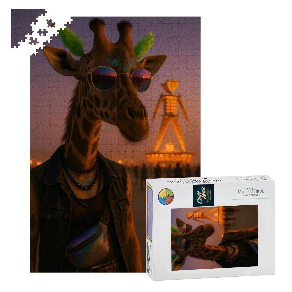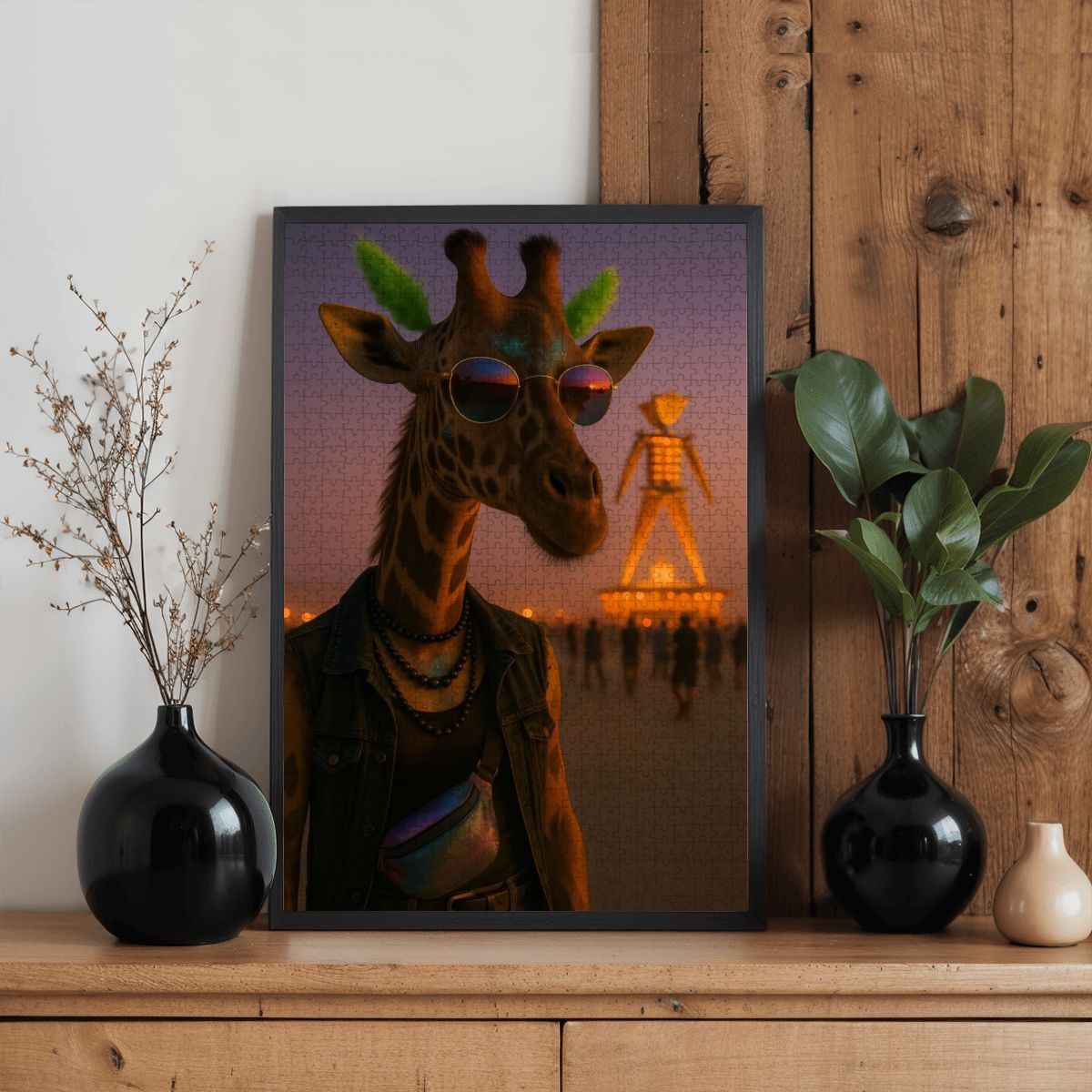 Welcome to the deep playa, where everything is temporary except the vibe. Towering above the sand in both height and spiritual frequency, this giraffe didn’t just show up—he ascended. With glitter on his neck, fluff in his ossicones, and a sparkly fanny pack guarding secrets from the cosmos, he's here for community, creativity, and probably a sunrise cuddle pile.