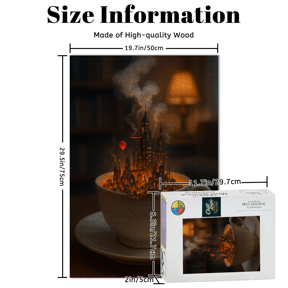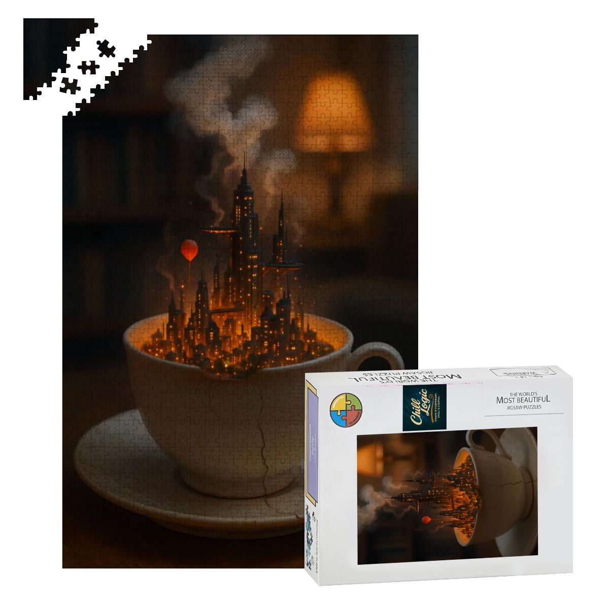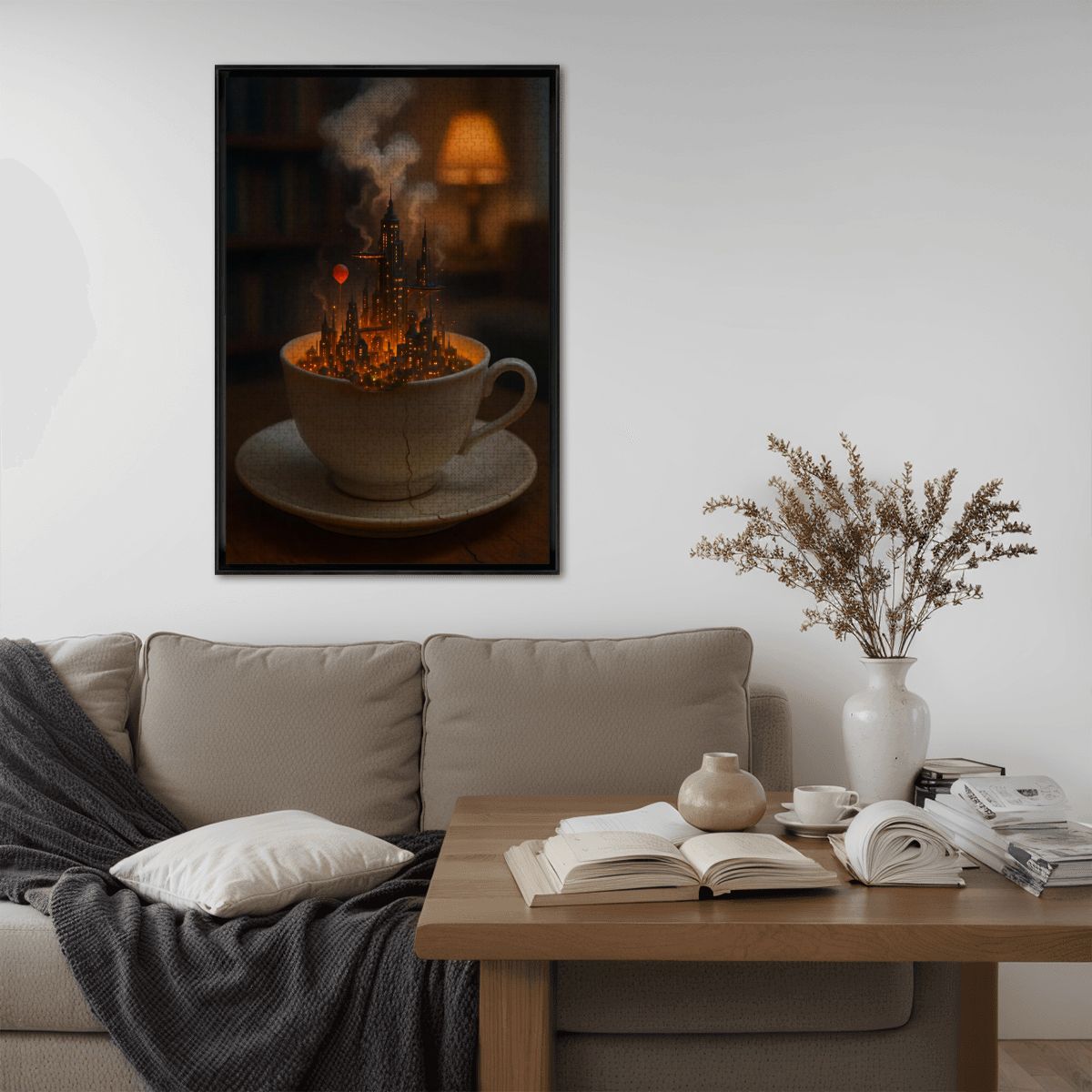 Here it is: the steaming, espresso-scented utopia no one asked for and everyone deserves. An entire glowing city, nestled impossibly inside a cracked porcelain teacup. Office towers hum. A red balloon drifts quietly above zoning code violations. The steam? Probably souls. Or dreams. Hard to say.