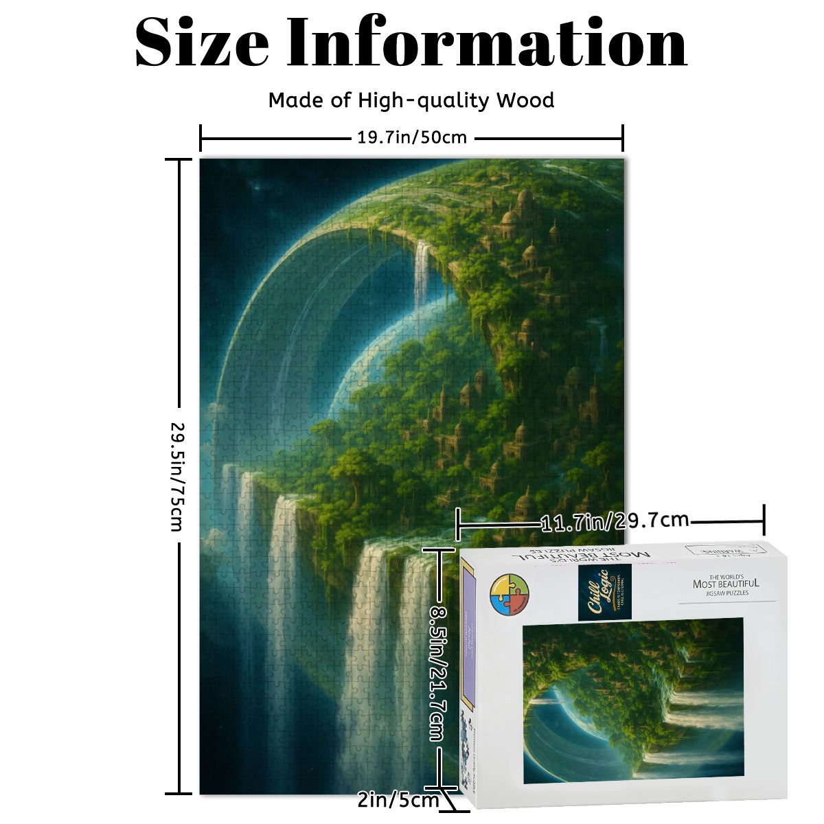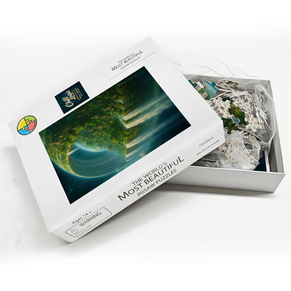 This puzzle is a delirious mix of natural wonder and impossible engineering. Between the misty falls, leafy canopies, and countless little buildings, you’ll wonder if you’re assembling paradise—or just proof humanity should never be trusted with cosmic-scale construction projects.