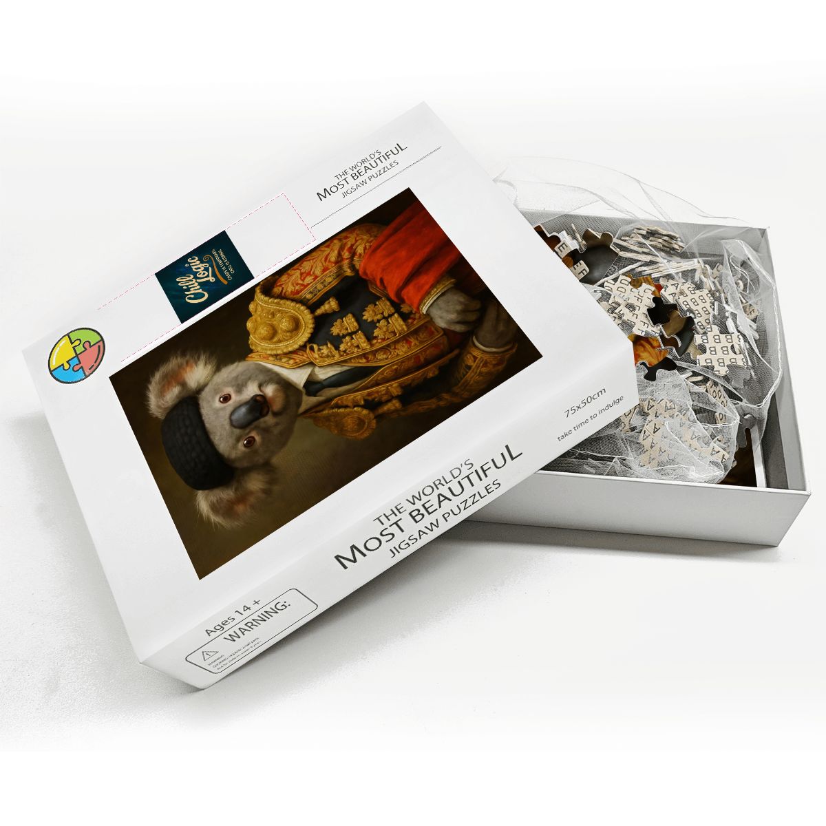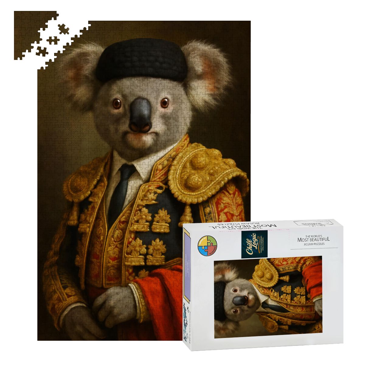 This portrait puzzle combines baroque detail with surreal charm, featuring golden embroidery, rich fabrics, and the most soulful eyes in the animal kingdom. Completing this is like hanging royalty on your wall—if royalty also climbs trees and eats leaves 18 hours a day.