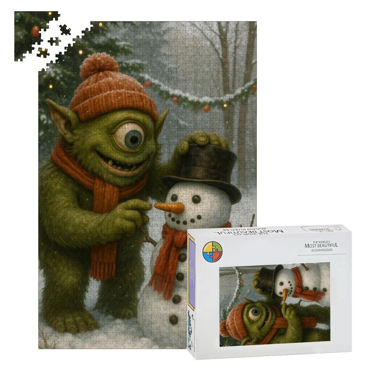 This puzzle captures a moment of unfiltered, wide-eyed glee—the kind of joy that can only come from someone with one eye and zero emotional baggage. He’s not judging you. He doesn’t even know what taxes are. He’s just vibing with a carrot and living his best snow-globe fantasy.