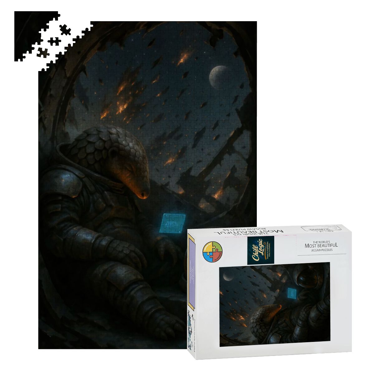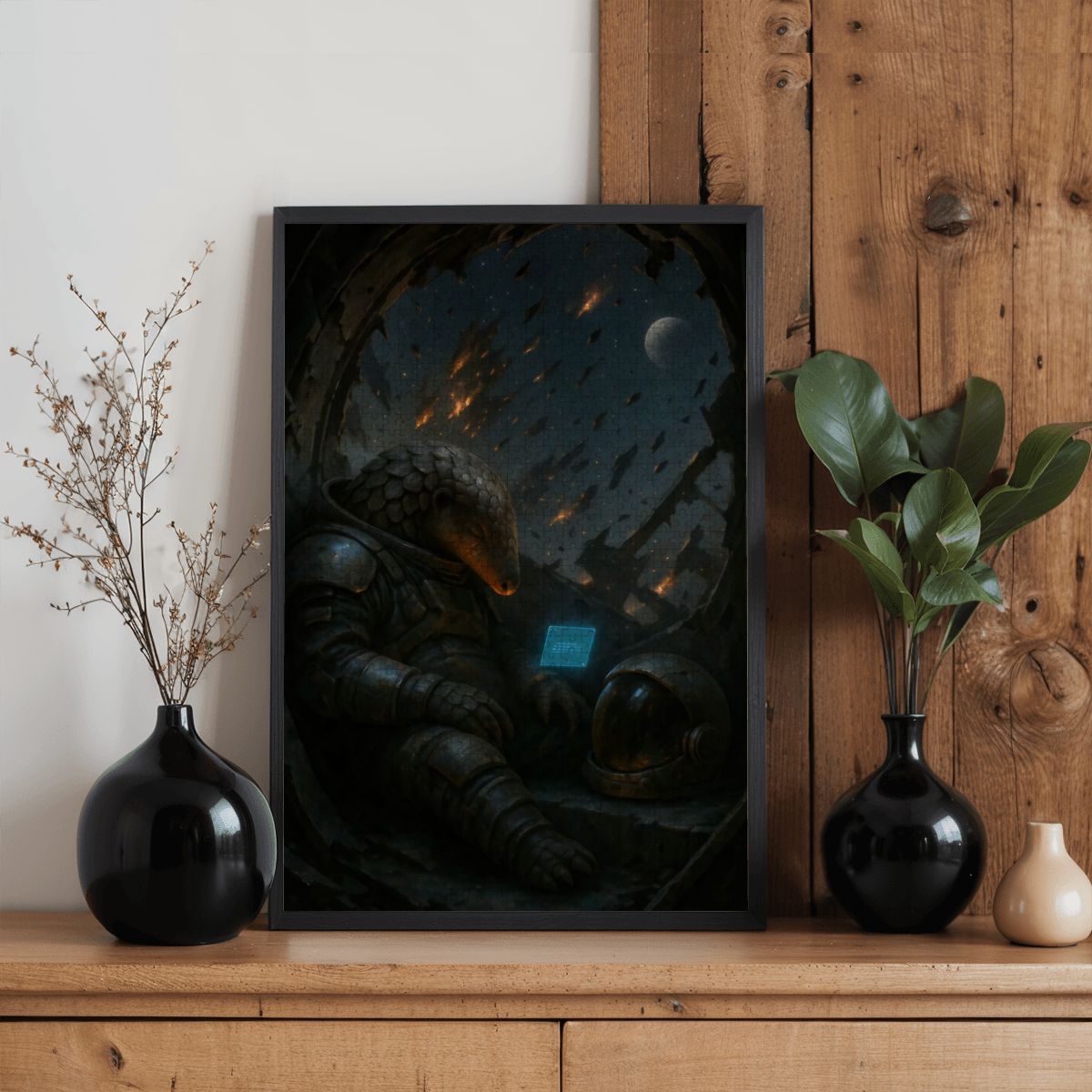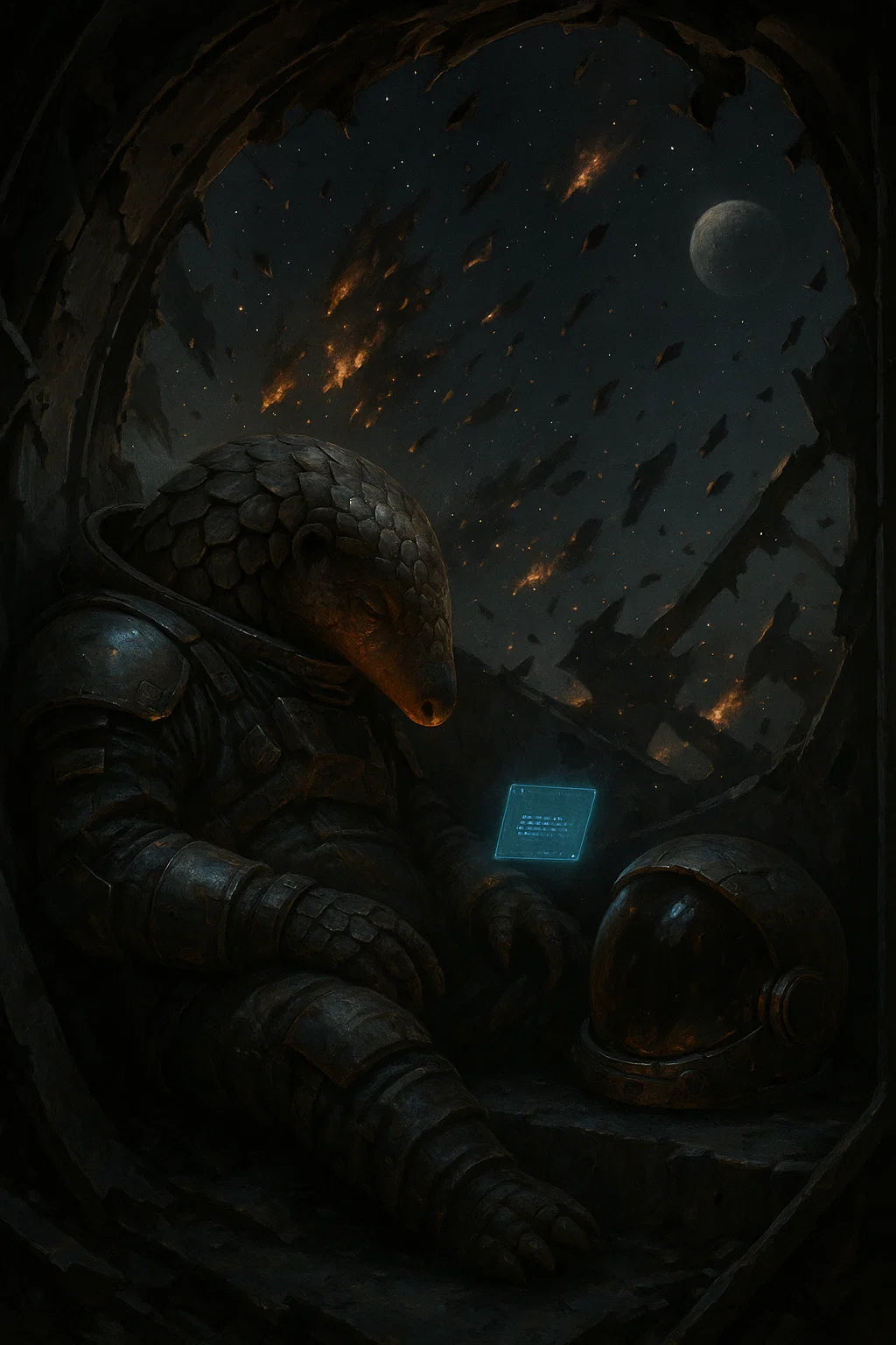 In the cold wreckage of orbit, a lone pangolin astronaut sits still—wrapped in silence and scorched metal. His helmet lies beside him. A faint blue signal flickers on a dying console. Is it a message? A farewell? Or just static from a planet that forgot him?