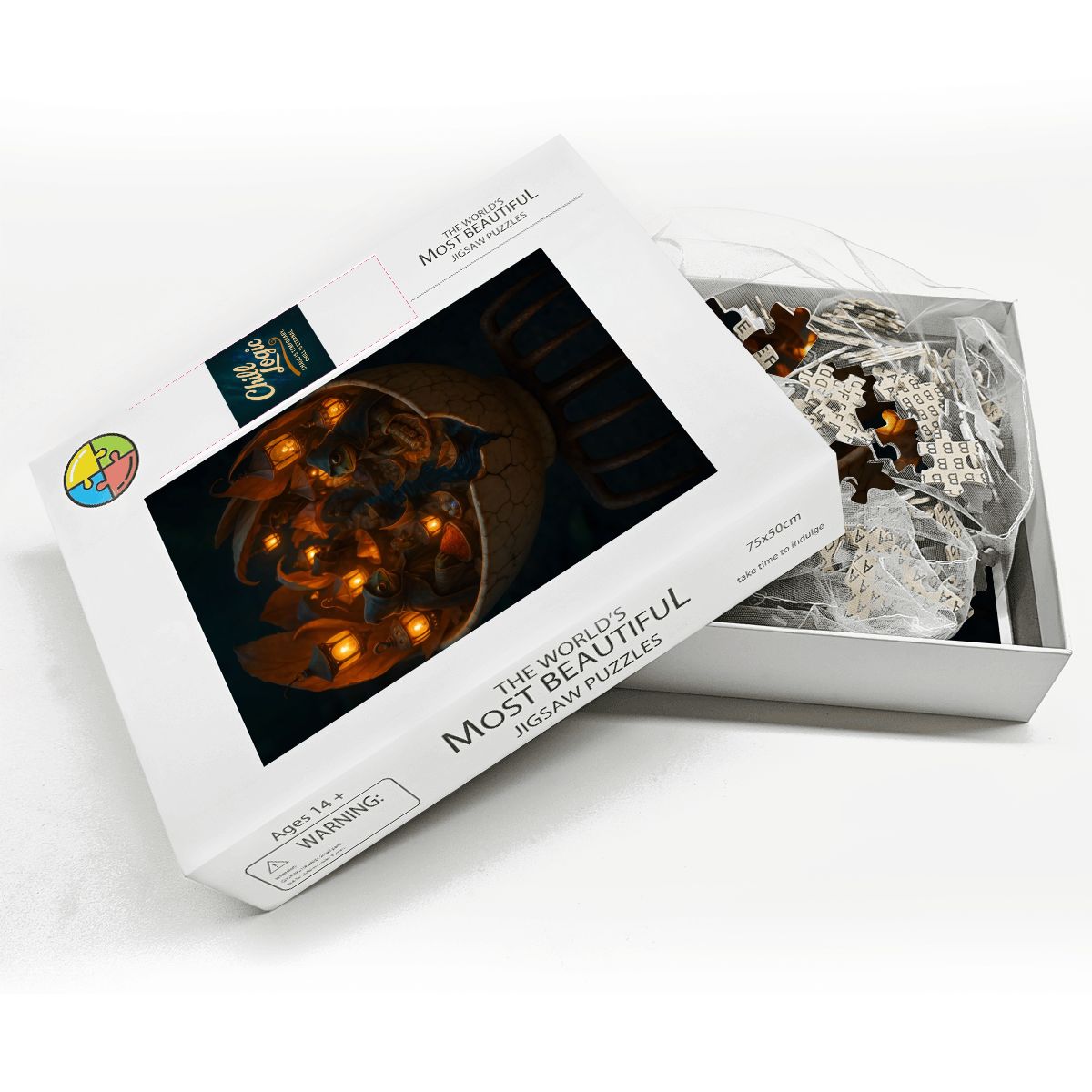 Each puzzle piece feels like a secret transaction in an underground alchemy guild that moonlights as Etsy artisans. The frogs are selling glittering powders, mysterious rolls, and definitely-not-cursed marbles. I’d say “don’t ask questions,” but you already bought the puzzle, so.