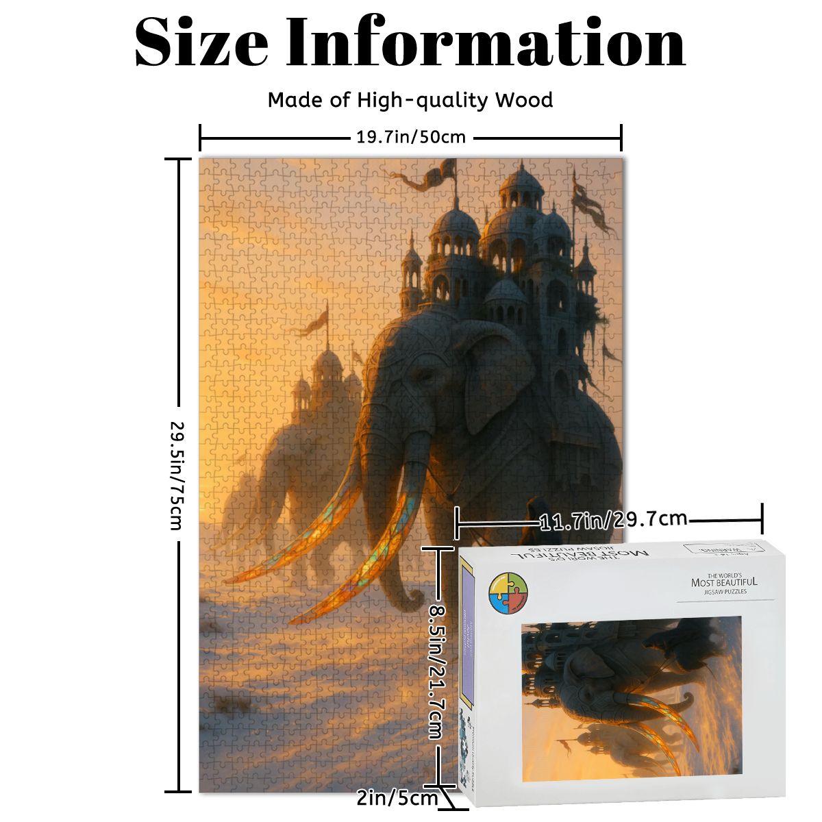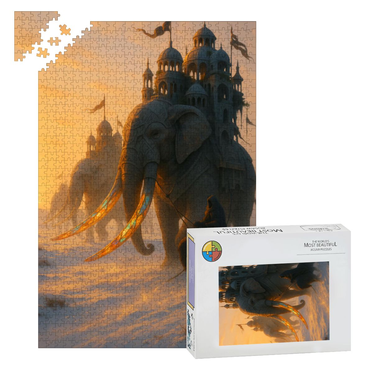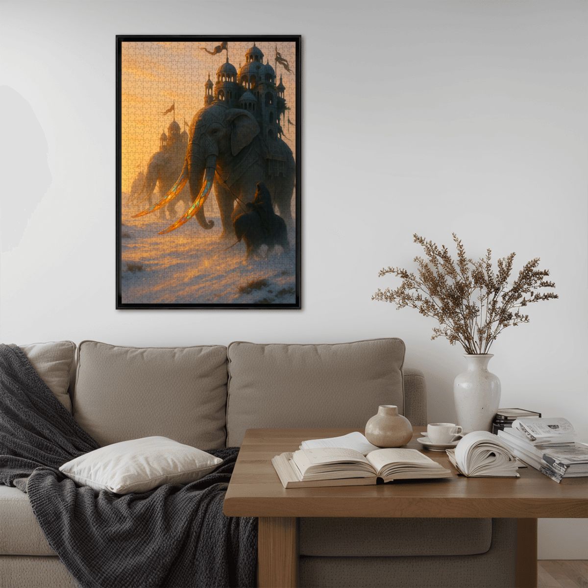 Behold the slow, regal procession of glass-tusked elephants carrying cities on their backs across a glowing snow-covered dreamscape. Each tusk glows like molten stained glass, refracting the sunrise as if time itself were being bent and reframed. These are not beasts of burden. These are ancient architects of memory.