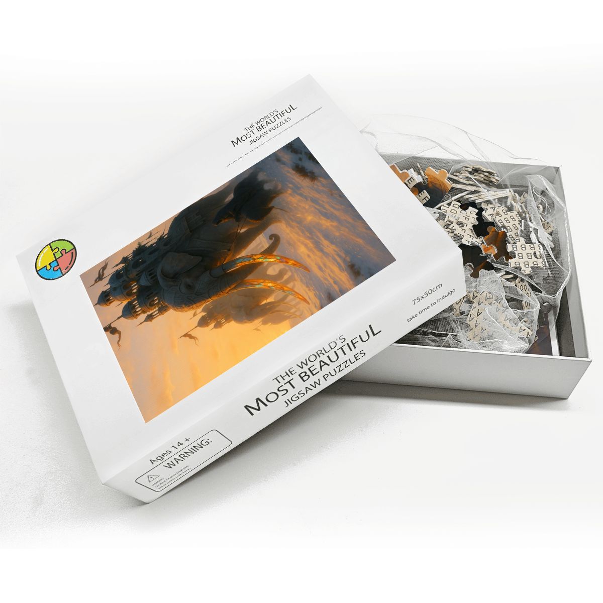 The massive towers built atop their backs sway gently with the movement, revealing tiny balconies, trailing flags, and overgrown gardens from forgotten empires. You are not just assembling a puzzle—you are unearthing myth.