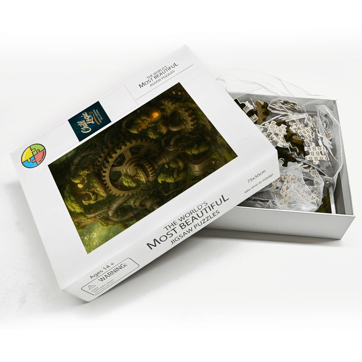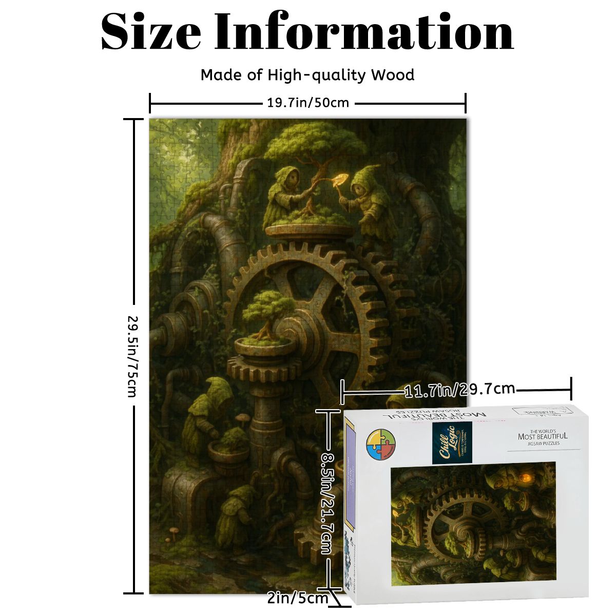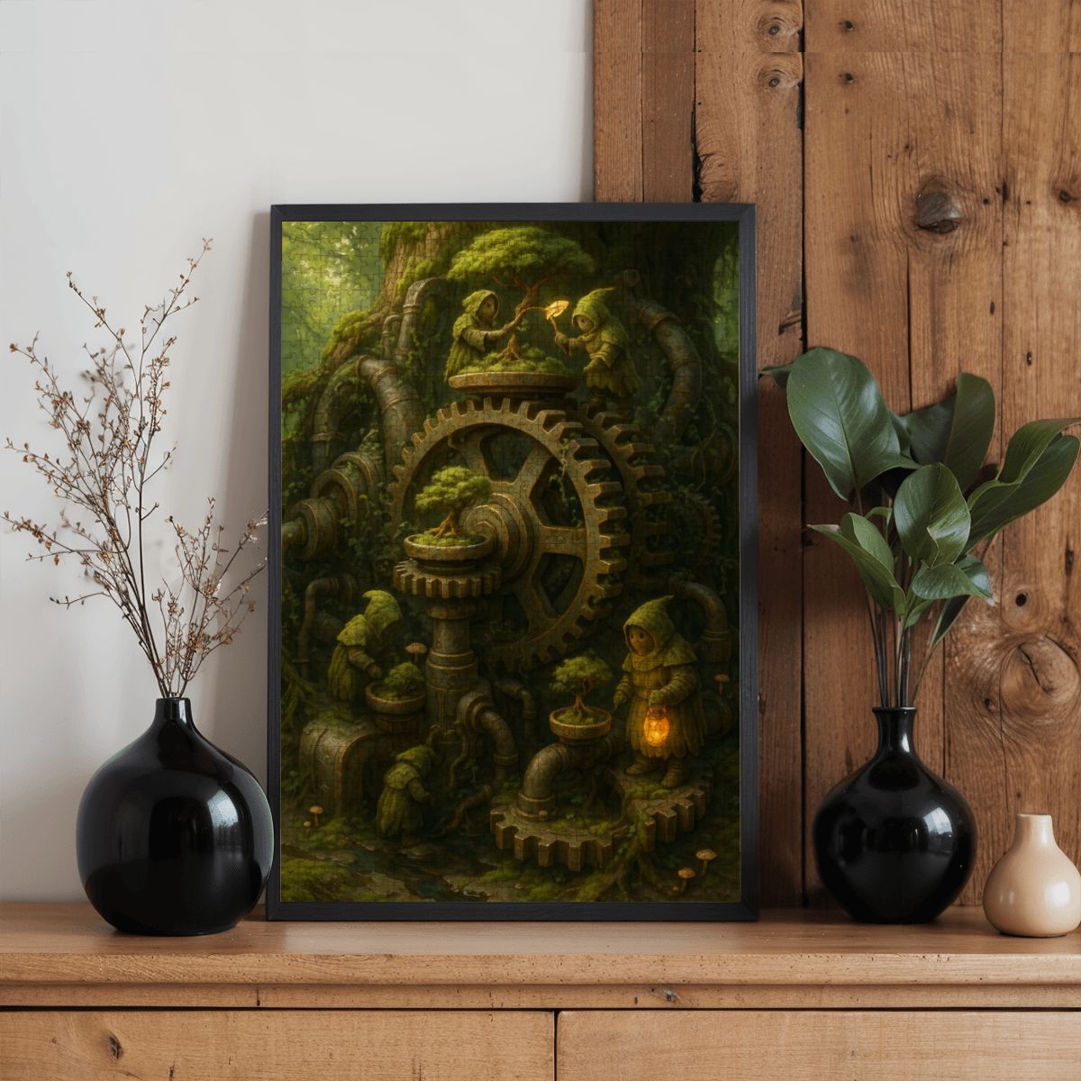 This puzzle is a meditation in contrast—piecing together the coarse, weather-worn textures of the machinery before shifting into the lush softness of moss and foliage. The hooded figures, with their gentle tending, add a human (or almost human) element that feels both mysterious and comforting. The interplay of warm lantern glow against the cool forest shadows challenges the eye and rewards patient assembly.