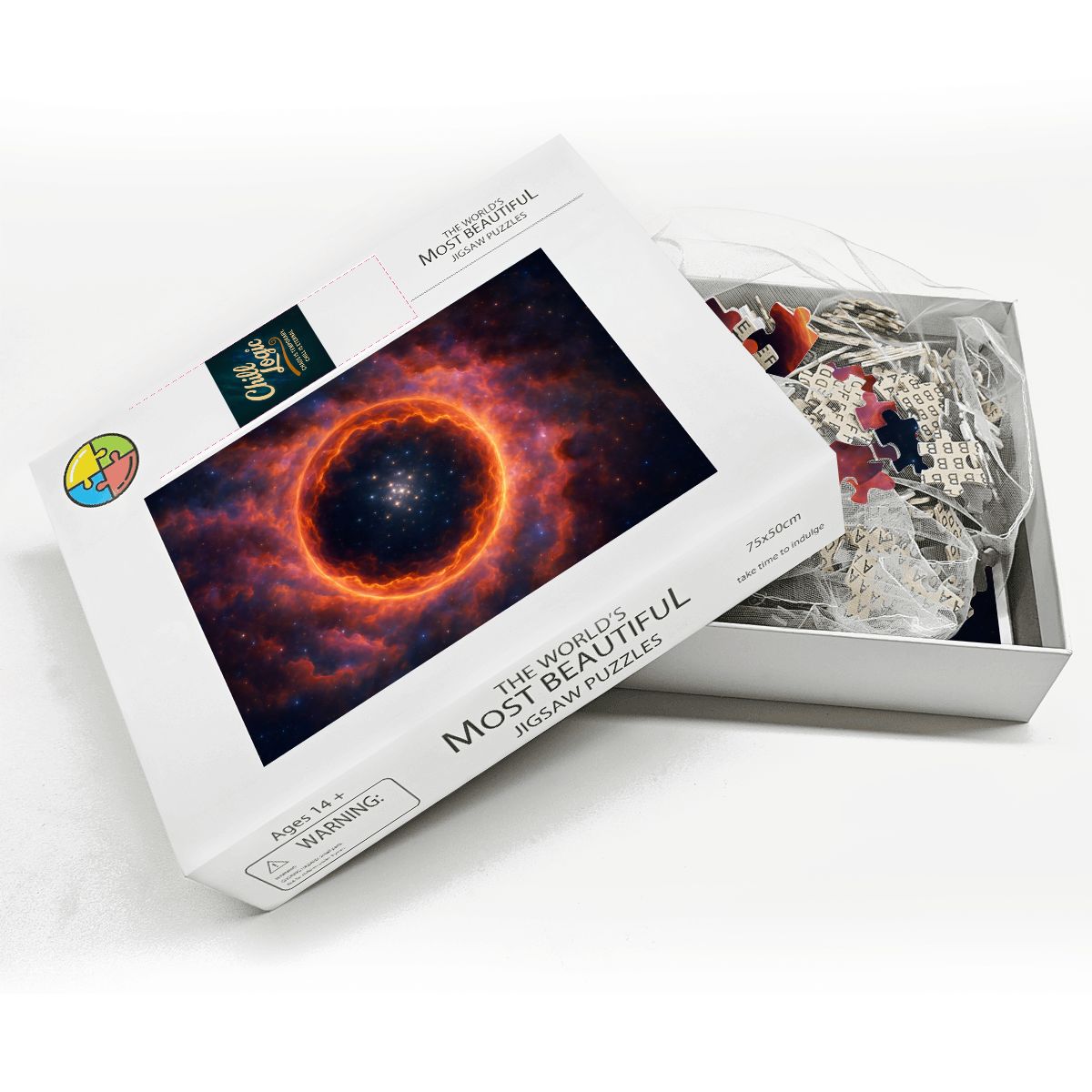 A cosmic eye, a fiery ring, or maybe the universe’s most ominous donut—whatever you see, this puzzle demands total focus. A blazing halo of orange flame swirls in the void, circling a star cluster that looks equal parts inviting and terrifying. Every piece is a duel between glowing chaos and infinite dark.