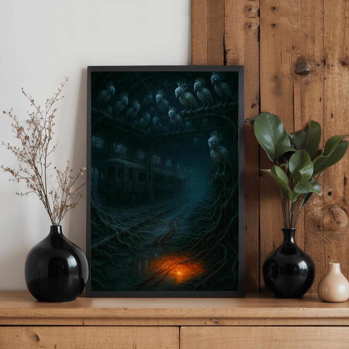 All aboard the memory you were never meant to remember. This decaying train station, swallowed by roots older than language, is watched over by a jury of bird-like sentinels with cold, glowing eyes and hair like withered crowns. They do not blink. They do not leave. They only judge. The tracks no longer lead anywhere known to man, and the blood trail? Well, thatβs between you and whatever stepped off the last train.