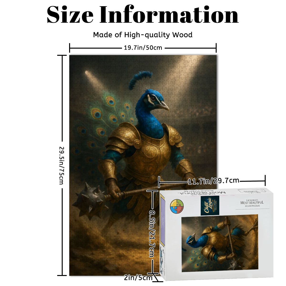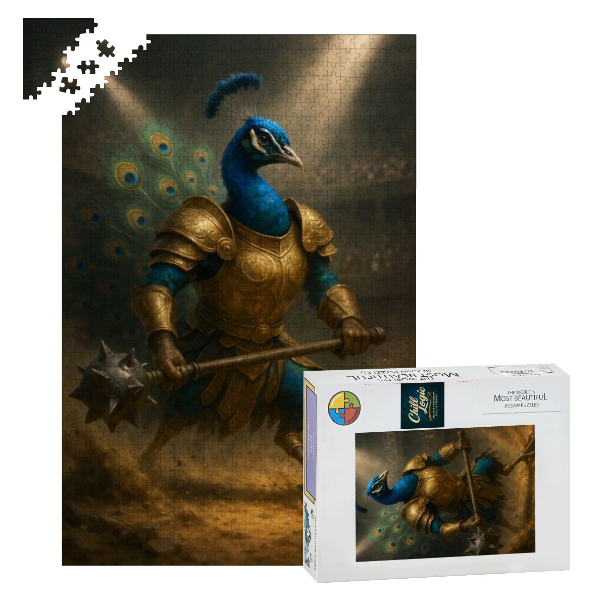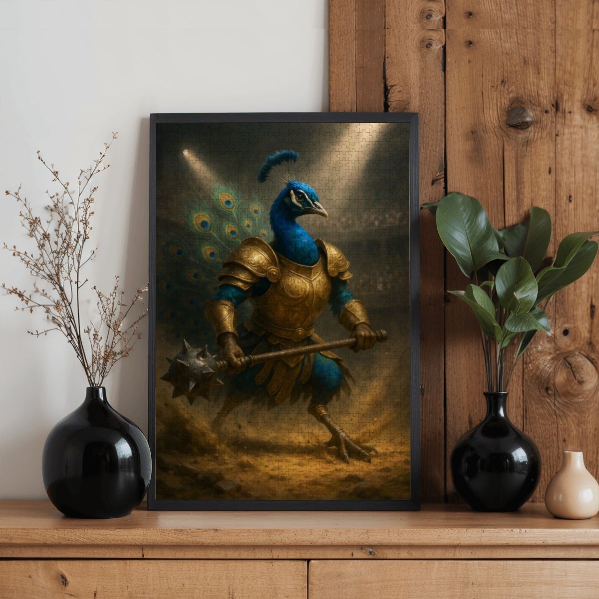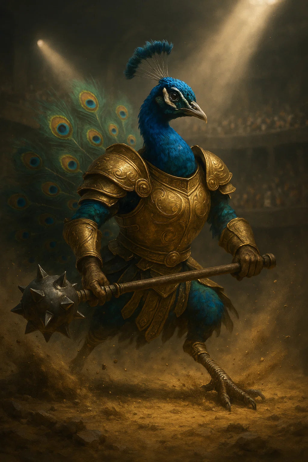 A peacock, resplendent in sapphire and emerald, stands in the heart of an ancient arena—not merely a symbol of vanity, but an armored warlord wielding a spiked mace like it’s an extension of its own fury. Golden plate armor curves over its breast and shoulders, etched with swirling patterns that echo the hypnotic eyes on its fanned tail. Dust swirls around its talons, lit by twin beams of sunlight slicing through the gladiatorial stands where blurred crowds roar in expectation.