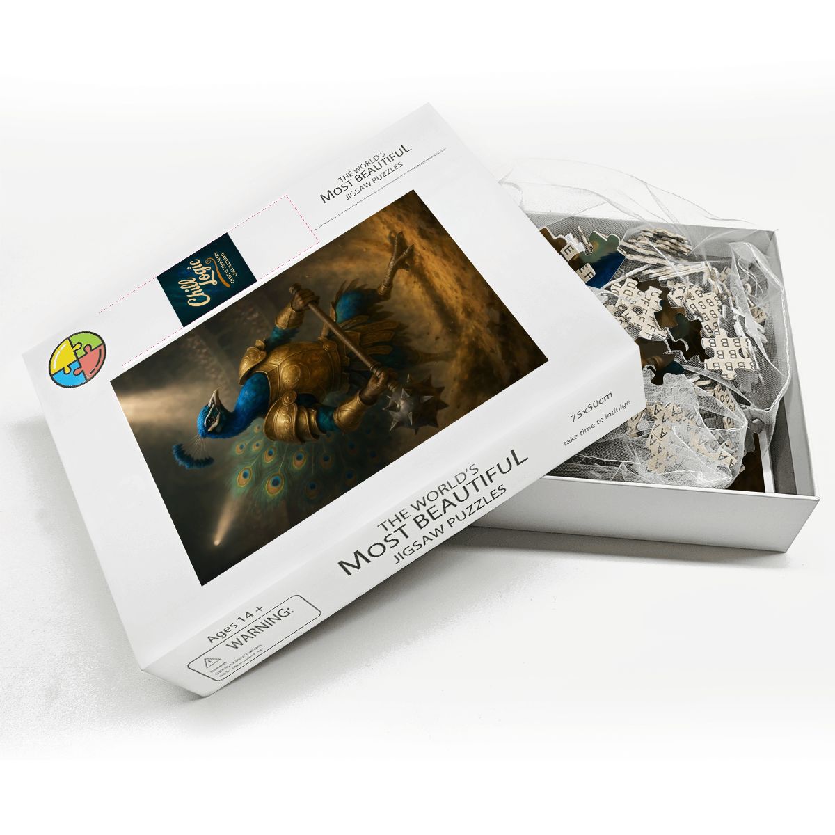 This puzzle is an intoxicating mix of opulence and grit. One moment, you’re fitting together the iridescent feathers of its tail, a cascade of jewel tones that seem to glow from within. The next, you’re lost in the deep gold metallics of the armor, each plate catching the warm light differently. Then, the dusty arena floor—subtle in hue, yet intricate in texture—pulls you into the scene’s heat and weight.