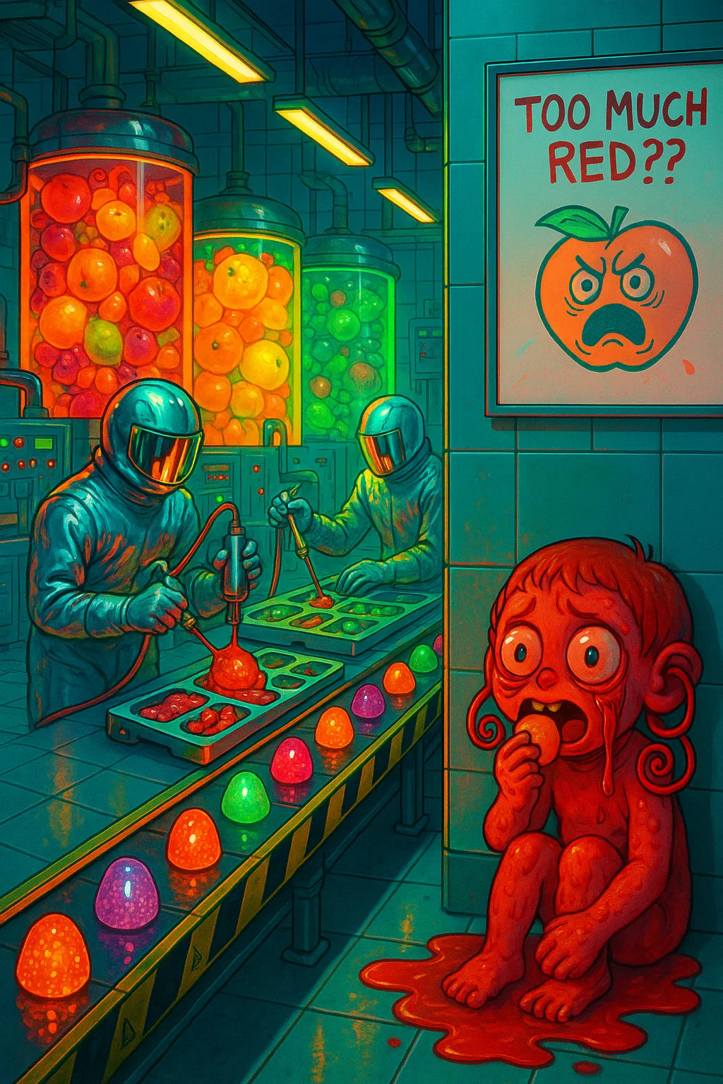 Welcome to the fruit-fueled dystopia you didn’t know you needed but now can’t unsee. This hyper-saturated nightmare of a flavor lab gone off the rails is equal parts industrial precision, corporate madness, and juice-based identity crisis. Scientists in reflective hazmat suits cook up candy abominations under the stern gaze of an anthropomorphic fruit overlord… while a small, goo-soaked red goblin-child sobs quietly in the corner, mouth full, soul empty.