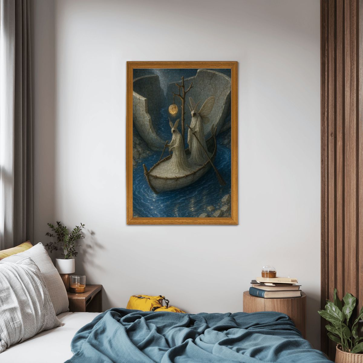 All aboard the ghost ferry, where moth-priests in burial robes silently paddle you through the cosmic yolk of your own subconscious. The boat is stitched from bark and hush, lit only by a swaying ammonite lantern, and the river? Oh, that’s liquid star memory flowing from the cracks of an ancient celestial egg someone forgot to refrigerate.