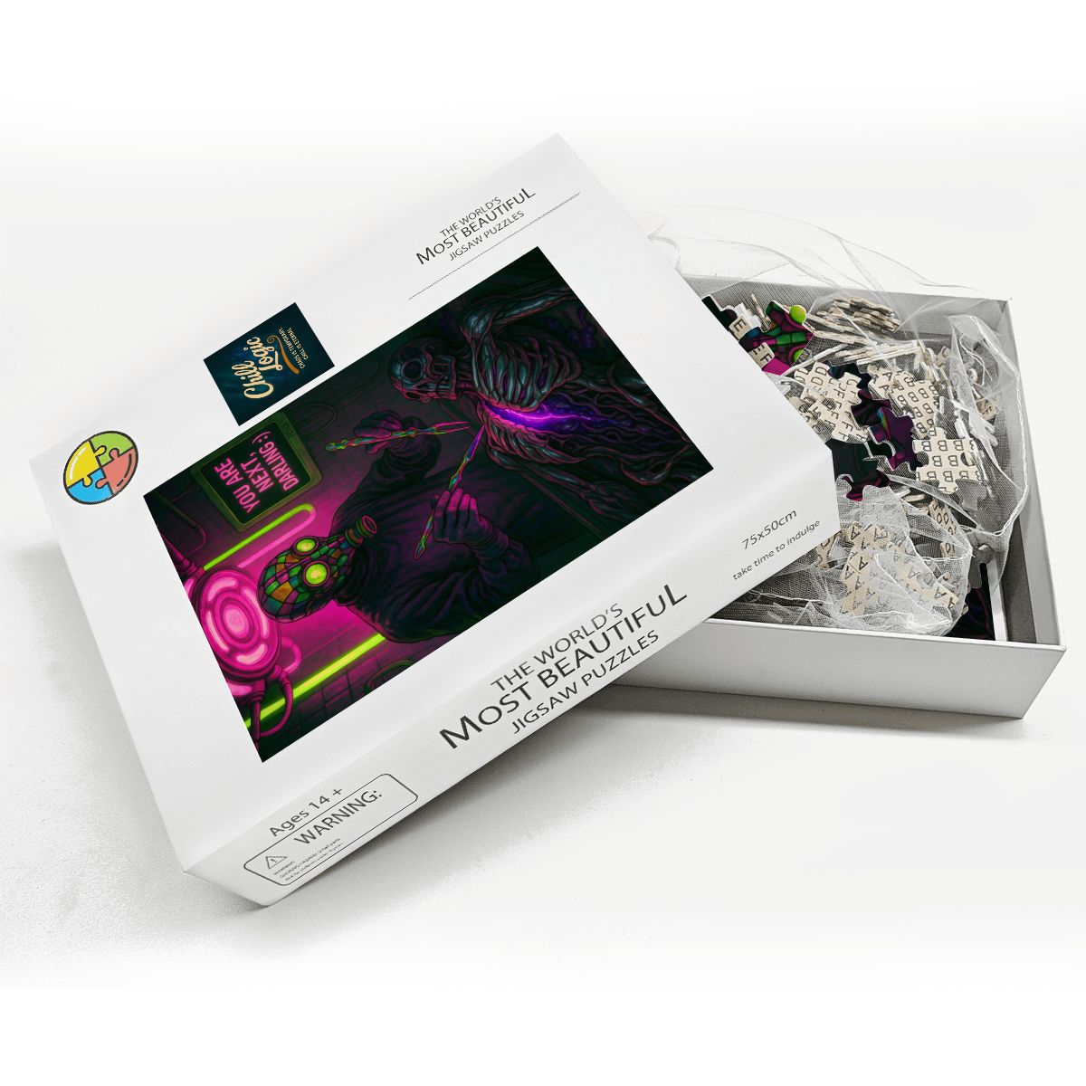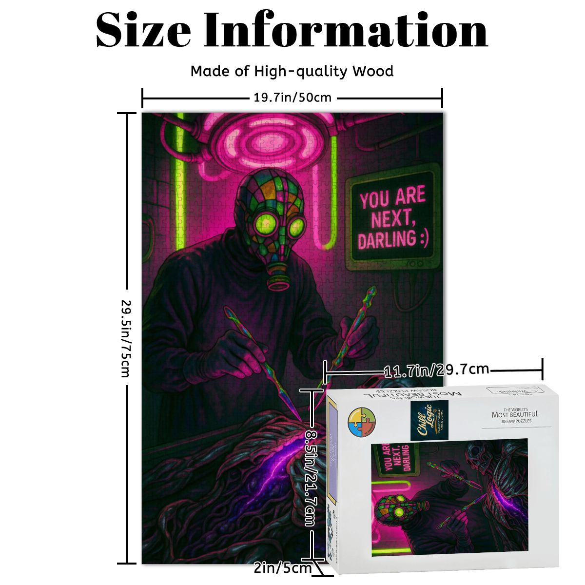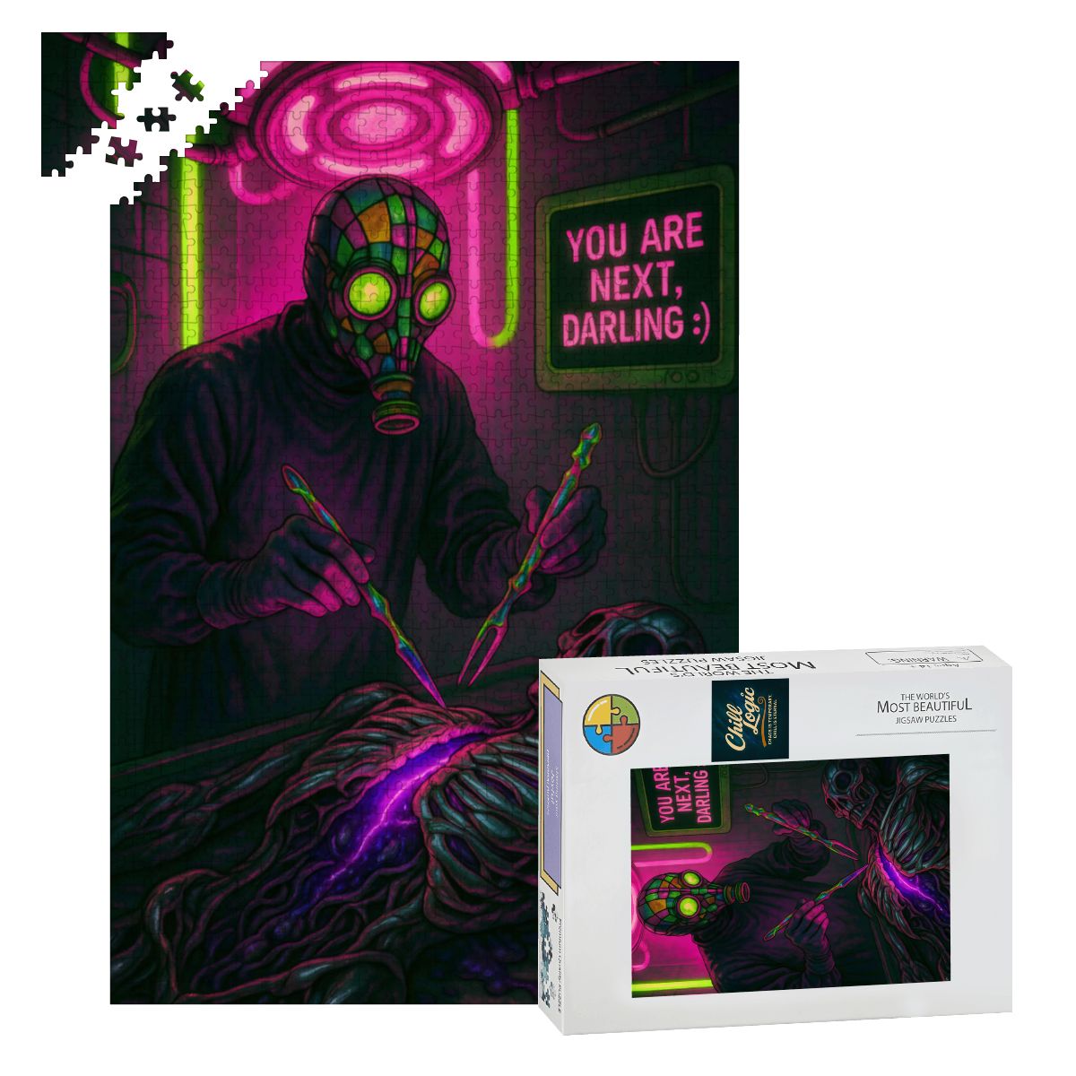 Every piece of this puzzle clicks together with the sound of a heart monitor flatlining. From the unnervingly cheerful wall sign (“YOU ARE NEXT, DARLING”) to the gas mask designed by a disco ball with trauma, this one’s a fever dream in high-saturation color and poor judgment.