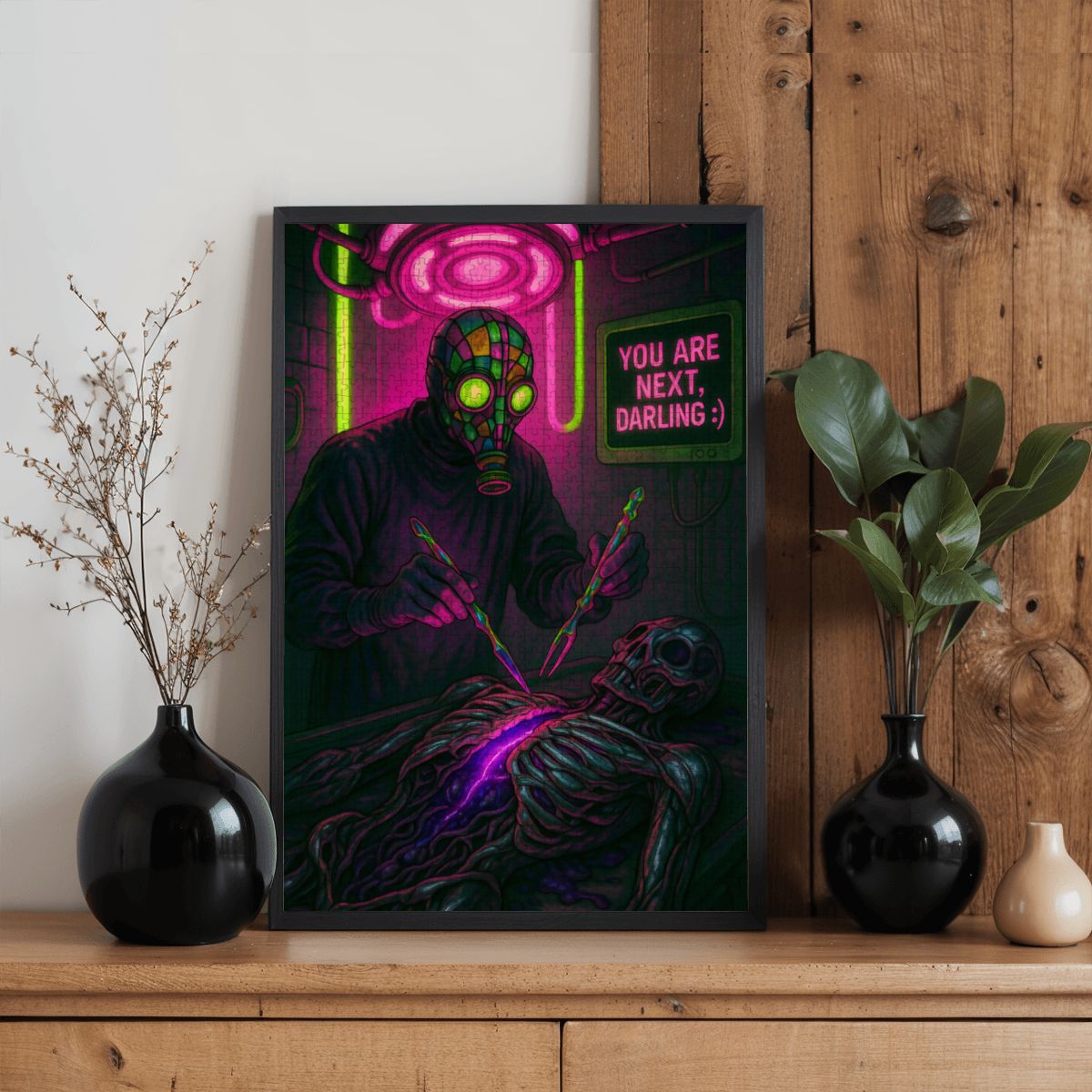 Welcome to the surgical rave nightmare that should never have left the sketchbook. This is what happens when cyberpunk neon aesthetic goes on a bender and wakes up in a meat locker. A doctor—if we’re being generous—is mid-operation on a corpse that looks like it’s been peeled like a sad banana of doom, revealing a pulsing purple glow that screams “forbidden candy.”